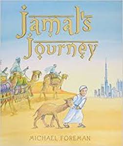 Jamal is a little camel that has to walk, walk, walk through the desert to keep up with his friend, the boy, and the other camels in the caravan. A sandstorm separates them. He meets different desert animals, but none can help him. A wise falcon reunites Jamal with his family. Eventually they reach Dubai and the colorful marketplace. Rich watercolor paintings show the sights of the desert and the city. An author’s note tells that the story was inspired by Foreman’s visit to Dubai and that the word jamal means beauty and camel. mjw |